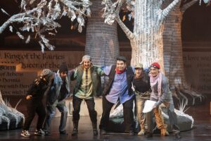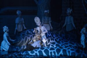 Яркие декорации, костюмы (художник-постановщик — Виктория Хархалуп) и сценографию дополняет насыщенная световая гамма оттенков (художник по свету — Эмиль Авраменко), пересекающаяся с увлекательной оркестровой фактурой сочинения. Музыкальная ткань пронизана сквозным развитием и обилием лейттем, особая роль принадлежит хору (блестящая работа хормейстера Максима Пожидаева). В опере немало выразительных хореографических сцен (балетмейстер – Павел Самохвалов). И, наконец, выбор солистов тоже оказался весьма предсказуемым, особенно учитывая неожиданную находку маэстро Хохлова – молодого контратенора из Тольятти Андрея Частухина, необычайно органичного и выразительного в роли царя эльфов и фей Оберона. Он странный, но вовсе не зловещий персонаж и наказание, придуманное для Титании, царицы эльфов и фей  (Софья Цимбал), влюбиться в первое существо, которое она увидит после пробуждения, не приносит никакого вреда.  У главных героев наряду с пением была еще одна непростая задача.  Они работали на котурнах — очень высоких платформах, задающих определенную пластику.