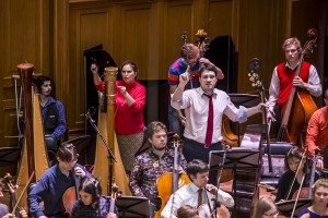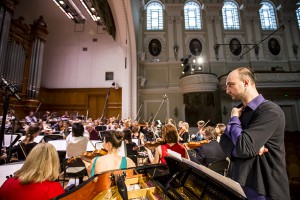 Не могу судить, насколько точно повторяла рассадка музыкантов тот, первый Персимфанс. Но выглядело впечатляюще. Вместо «веера» с дирижёрским подиумом в центре «ручки» — почти круг, вернее овал, плотно и равномерно занятый пультами. Часть скрипачей спинами к залу, виолончели – внутри круга слева от публики, где обычно вторые скрипки, деревянные духовые – в самом центре. Такой порядок обеспечивает максимальный визуальный контакт между группами и внутри каждой. Сразу отмечу, поведение большинства музыкантов, их мимика, движения корпуса, выгодно отличались от стандартной оркестровой позы, часто ремесленно равнодушной. Здесь даже спины девушек-скрипачек по выразительности приближались к драмбалету. Время от времени в роли «капитана» выступали то флейтист, то Пётр Айду за клавишами сбоку, то контрабасист Григорий Кротенко, то первый гобой. Само понятие «концертмейстер группы» в этой кучной рассадке терялось для зрителей, про лидерство отдельных музыкантов приходилось догадываться, видя знакомые по концертам РНО, спектаклям Большого театра, МАМТа и камерным вечерам лица внутри групп. Все без исключения молоды (средний возраст около 30), красивы, одеты кому как удобно. От традиционных для арфисток пышных вечерних платьев (разноцветных!), до пёстрых брючек у отдельных скрипачек, цветных сорочек у мужчин, не исключая и традиционного чёрного цвета. В группе виолончелей выделялась высокая фигура Петра Кондрашина. Концертмейстер Большого театра осуществлял «связь времён и поколений нить» в память о прадеде и прабабушке, родителях маэстро Кирилла Кондрашина, участниках того, первого Персимфанса.