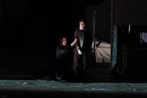Первое действие оперы представляет собой сложнейший контрапункт — намеренное противодействие музыкальных линий, протягиваемых в оркестре, и речи героев, будто бы их перебивающих. Этот художественный эффект сумятицы, дисгармонии, требует строжайшей дирижёрской дисциплины и точнейшей непростой координации, когда у каждой руки дирижёра отдельная виртуозная партия. Дирижёр Алексей Асланов, знающий спектакль “Поворот винта” с детских лет (когда-то он сам исполнял партию дисканта Майлза) справлялся со своими задачами отменно, строго и сосредоточенно соединяя псевдоразрозненные нити партитуры в одно целое, давая музыкальному действию осмысленность и беспрерывность.