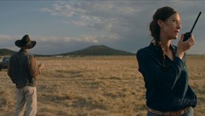 В фильме также часто эксплуатируется нечеловеческий ракурс”. Камера может взять и уплыть куда-то вбок, забыв про героя в кадре, и наблюдать за точками на горизонте. А может, как в одной из самых эффектных сцен фильма, как раз связывающей природу и урбанизм, как впадающие друг в друга миры, заставить нас смотреть на мир из-под брюха самолета.