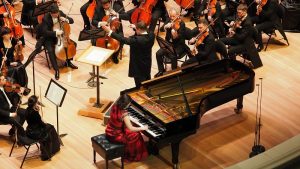 Концерт Государственного симфонического оркестра Татарстана открыла Третья симфония ля минор, соч.44 Сергея Рахманинова – лирическая поэма о России, проникнутая патриотичной любовью к отчизне, овеянная романтической дымкой меланхолических воспоминаний, умудренная опытом и мастерством зрелого художника. Александр Сладковский добился от оркестра ярких красок и мощной амплитуды звучания. То же самое можно отнести и к страстно исполненной затем Рапсодии на тему Паганини для фортепиано с оркестром ля минор, соч.43 Сергея Рахманинова. Мечтательная лирика и экспрессивность характеризовали тончайшую игру Екатерины Мечетиной, которая искусно справлялась с головокружительными пассажами на фоне драматичного аккомпанемента оркестра. Хрупкий просветленный бис пианистки — Колыбельная Петра Чайковского в транскрипции Сергея Рахманинова также был облечен в траурные тона.
