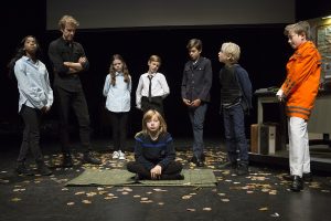 Короткие сценки охватывают всю историю Бельгии – от провозглашения независимости Конго до массового «Белого марша», спровоцированного делом Дютру. Внизу дети точь-в-точь повторяют позы, слова и жесты взрослых.  И вот тут-то в  зале заканчивается радостный смех умиления, и начинаются поерзывание и неловкость. Когда ребенок повторяет грубое слово или совершает действие,  подсмотренное у взрослого –  это временное неудобство, короткий эпизод. Можно немного постыдиться и как-то замять. Когда ребенок повторяет жесты и слова, определившие историю и сделавшие мир таким, каков он сейчас – это уже  не просто неловкость.  И уже больше, чем стыд. Довольно быстро история  теряет признаки времени и конкретной страны. Зеркальное отражение жизни старших в  детской вариации превращается  в рассматривание зрителей через оптический прицел. Те, кто смотрит – моложе и безжалостнее. Их действия лишены взрослого расчета и соображений политики и морали. И оттого в них отчетливо видна истинная подоплека – страх, жестокость,  ненависть к ближнему.   Норвежский драматург написал, что юность – это возмездие. Шведская активистка крикнула в лицо миру взрослых о том, что они лишают ее ровесников детства. Швейцарский режиссер телами и голосами  детей рассказал о  бельгийском педофиле и маньяке,  принадлежащем тому самому миру взрослых.
