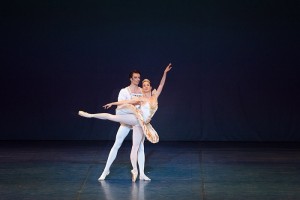 «Grand pas classique» на музыку Обера (хореография В.Гзовского) отдали дань французскому балету еще и тем, что поручили мужскую партию работающему в театре французу Эвену Капитену. Танцовщик он внешне привлекательный: высокий рост, утонченные черты лица. Неплохие от природы стопы, хотя для француза не слишком «поющие». Впрочем, это объяснимо. Эвен учился не в Париже, а в Минске, а русская «школа» не может конкурировать с французской в формировании грамотности работы ступней. Несколько суховатые ноги затрудняют заноски, но вращения и прыжки выполняют отменно. Партнершей Эвена стала Екатерина Олейник. Тяжеловатый корпус не отразился на уверенности ног артистки. Правда, ей не удалось нужное время выстаивать в retire, чтобы приземляться одновременно с окончанием tour кавалера. Эта изюминка данного дуэта покоряется немногим. Тем более непонятно, зачем браться за исполнение «pas de deux Обера», не владея приемом стопроцентно? Зато Олейник прекрасно справилась с диагональю releve, которая, будучи изуверски сложной, удается далеко не всем балеринам. В общем, всем, кто хочет блеснуть «Обером», следует помнить, что это парадный хореографический портрет балетных премьеров, здесь важно все: безупречная внешность не менее соответствия стилистическому своеобразию, и, бесспорно, техническое совершенство (огромный запас прочности).