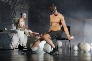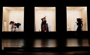 Действие распределено в рамках трёх чётких структур. Начинается всё с хождения со свечкой, и если в начале оно представляет собой высмеивание аналогичной сцены из «Ностальгии» Тарковского, то «арка» к нему в середине и, особенно, в конце первого акта — это уже гениальная метафора. Вместе с ней другие персонажи как бы суммируют то, что они делали в первом действии и «резюмируют» экспозицию. Второй акт имеет двухчастную структуру. Сначала звучит рассказ о Париже (об этом чуть позже), приводящий к своей кульминации: недонаряженный в женское платье артист (Бенуа) торжественно декламирует текст под звучание Марсельезы в исполнении Мирей Матьё. А далее идут монологи трёх женщин, распределённых по трём «ящикам», символизирующим комнаты. Салманова по скайпу рассказывает мужу об их дочери. Юлька говорит сама с собой и иногда с Бенуа. Она в «гинекологическом» ключе рассказывает о своей любви к Грише. Лиза, облачившись в колдунью и под «аккомпанемент» зажжённых свечей читает отрывок из будущего романа возлюбленного, лежащего рядом. Сначала все они долго говорят по очереди, затем их фразы становятся короче, но ускоряется темп передачи реплик, заставляя слушателя с каждой минутой всё быстрее переключаться с одного монолога на другой. В конце действия героини от слов переходят к танцу, а внимание с одной на другую перескакивает уже благодаря быстро включающемуся и выключающемуся свету в их «коробках». Скорость работы лампочек растёт пропорционально громкости музыки и по достижении естественного предела зрительского восприятия всё обрывается. Третий акт построен по принципу постепенного сведения общей динамики действия до минимума.