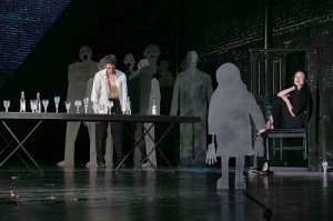 Декорации в спектакле символические и выдержаны в чёрно-белых цветах. Мебель — только самая необходимая. Качели. Шары. Картонные силуэты людей и дерева. Три кирпичных стены. Иногда появляется чёрный диск. С обратной стороны он снабжен оранжевой лампочкой и, когда его появление сопровождается спуском белой стены, он напоминает солнечное затмение.