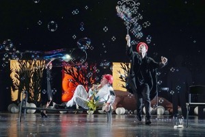 Особая атмосфера на спектакле создаётся благодаря растянутому времени. И эта тягучесть наполняется всякий раз по-новому. В первом действии можно обратить внимание на такие вещи, как объятия Лизы и Гриши. В любой другой стилистике это были бы просто «обнимашки» разной степени «откровенности», а у Бутусова оно останавливает время и объятие плавно перетекает в танец под музыку саксофона. В третьем действии персонажи «материально» растягивают слова и нарочито медленно выполняют неестественные движения. И это очень уместный приём. В этот момент хрупкий интеллигентский мирок лопается от вторжения извне. Органы опеки забирают девочку. Лишь мать по-брехтовски отстраняется от своего персонажа, взирая на этот кошмар с дистанции и рассказывает о Париже бесцветным голосом. Действие вроде бы повисает незавершённым и по тексту мы действительно не слышим полноценной «развязки», но зато здесь Бутусов делает замечательный театральный финал, визуализируя образ, звучавший в главном монологе: все герои надевают красные береты и запускают летать по сцене огромные мыльные пузыри. Наш мир не обречён, если в нём присутствуют такие вот моменты.