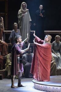 Как рассказывает сама Ольга Иванова, пришлось продумать реконструкцию декорации для более объемной и технически усовершенствованной Новой сцены Большого театра. В целом из Камерной получилась масштабная, очень сценически красивая постановка, задействующая свет, видео и технические эффекты, реализуемые на большом римском амфитеатре, периодически меняющем свои функции, но позволяющем представить себе площади, храмы, и даже термы Рима. Многофункциональное и хорошо работающее решение художника Виктора Герасименко слегка созвучно использованию советского бассейна “Чайка” художником Марко Япелем, как основной декорации для балета “Мастер и Маргарита” Эдварда Клюга. По сравнению с постановкой в Камерном музыкальном театре также был расширен состав хора, введен миманс в хореографических сценах, и, собственно, появились новые солисты, включая участников Молодежной оперной программы Большого театра (Андрей Прысь, Илья Легатов, Демьян Онуфрак).