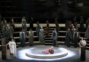 Сцена из спектакля. Фульциний Афер — Иван Давыдов, Сервилия — Екатерина Морозова, Претор — Демьян Онуфрак. Фото Дамира Юсупова / Большой театр
