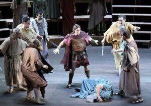 И в последнем действии Сервилия, вдруг обретшая новую веру по научению Неволеи, невольницы Локусты (Ольга Бурмистрова), вдруг умирает, хотя ее избранник Валерий уже дал вето на приговор ее отцу. В конце Сервилия дает знак Валерию не мстить Эгнатию, а простить его, все вдруг тоже уверуют и звучит “Credo”, а Сервилия возносится все выше и выше, как мученица.