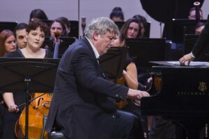 В интерпретации Второго фортепианного концерта коллективу из лучших молодых музыкантов страны прекрасно удалось показать богатую палитру красок, заложенных в произведении, прочертив и сквозную линию, обеспечивающую целостность. И в этом победа Алексея Рубина. Истинно русская Первая часть (Allegro brilliante e molto vivace) с ее «колокольными» аккордами, сначала звучащими тутти у оркестра, затем интонируемыми пианистом и обаятельнейшими лирическими темами захватывала то парадным блеском, то чарующей задушевностью. Во Второй части (Andante non troppo) в игру вступили солистки РНМСО — Елена Таросян (скрипка) и Лидия Аристова (виолончель). Чайковский здесь создал удивительное по своей благородной красоте трио: к этим струнным присоединяется рояль. Прозрачное, с оттенком легкой элегичности звучание инструментов создало атмосферу удивительной интимности, спокойствия и умиротворения. А Финал (Allegro con fuoco), где оркестр соревновался в виртуозности с Борисом Березовским, исполняя зажигательную, острохарактерную танцевальную тему, получился не просто торжественным, но и элегантным. Конечно, столь удачное прочтение сочинения, в первую очередь — заслуга Березовского, в манере игры которого нет ни грамма самоуверенности и желания показать себя во всей красе. Для музыканта важнее художественная выразительность: поэтому и «парадная» крупная техника выглядит у него не самоцелью, а средством. А ноктюрновые страницы, которыми богата Вторая часть, благодаря феноменальному туше Березовского просто обволакивали нежностью и теплотой.