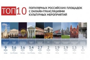 Лидером по количеству онлайн-трансляций стала Москва. Более всего просмотров на столичных площадках набрали концерты, фестивали, музыкальные конкурсы и конференции. Самой активной площадкой стал кафедральный собор Петра и Павла, набравший за год 9 млн просмотров. Суммарная аудитория онлайн-трансляций с московских площадок, вошедших в топ-10, за год достигла 20 млн человек.