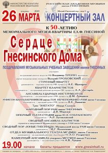 Сегодня почти все гнесинские учебные заведения живут самостоятельной жизнью. И 26 марта музей-квартира, как место сохранения их общей живой истории, как некогда прежде, объединит их деятельность в рамках одного праздничного вечера.