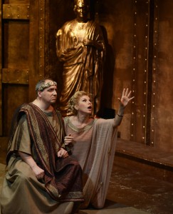 По периметру зрительного зала сооружены галереи (такие сплошные балконы), и действие частично происходит на них. Причём эти галереи с арками типично итальянские, выполненные из материала под бронзу и состаренное дерево, – красота неземная! А главное – всё это создаёт «настоящий» Древний Рим, каким мы его себе представляем! Поскольку в Камерном театре места для сцены очень мало, постановщики используют лестницу и подиумы разных уровней не только как элементы декораций, но и как места действия – чтобы разнообразить и несколько расширить ограниченное сценическое пространство.