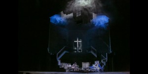 Но остается черно-белое противостояние многоцветному, заложенное в сценографии, которая создает яркий образ перекрестка судьбы. Планшет сцены пересечен крест на крест двумя подиумами – этакий перекресток дорог, за которым возвышается угловой придорожный дом-трансформер; в нем в любой момент могут уйти вверх передние угловые стены, представив нашему взору или родовое гнездо маркиза Калатравы, или придорожную таверну, полевой госпиталь или заброшенные и заросшие развалины, возможно, того самого родового гнезда.