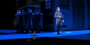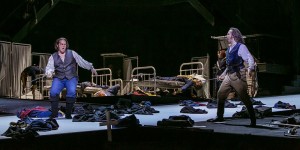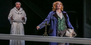 Чем же обусловлена, по Уорнеру, эта реинкарнация? А ничем, никакой связи ни внутренней, ни внешней (гримеры Земперопер поработали на славу) не обнаруживается, если только лингвистическая: и тот, и другой – padre. Стивен Миллинг в этих партиях продемонстрировал сильный с неплохим тембром бас и неплохие актерские навыки, в результате у него получились среднестатистические почтенный отец Калатрава и благочестивый падре Гуардиано. Сложнее обстоит дело с его дочерью Леонорой, которую исполняет знаменитая Эмили Мэги. Я слышала ее впервые и честно скажу, что не могу разделить восторги по поводу этой певицы. Для меня она – самое слабое звено в кастинге этой постановки. О вокале скажу только одно: по-моему, ее голоса просто не хватает для такой сложной партии. Но, к сожалению, и драматически она меня не убедила. Я не ждала от нее какого-то развития характера героини, но все же постоянное, несменяемое, плачуще-растерянное выражение лица на протяжении всего спектакля настолько удручало, что не отставляло никаких шансов на сочувствие и уж тем более сопереживание ее героине.