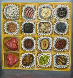 В галерее Alma Mater представлена выставка современного искусства «Эстетика повседневности». И правда, эстетика и красота присутствуют не только в каждом дне, но и в каждом предмете. Смотря как отобразить этот предмет, конечно. Мне очень приглянулись работы Валентины Сергеевой «Шоколадные конфеты», «Пиво», написанные в супермаркете «Пятерочка». В залах галереи можно увидеть «Метро» и «Муху» Владислава Субботина и работы Александра Заикина — сюжеты с минимумом формы, написанные в технике живописи жестких контуров, характерной для стиля «поп-арт».