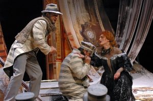 События первого акта разворачиваются в Санкт-Петербурге, в особняке куртизанки Стефании. Сутенер Глебов разгневан – где Стефания, почему ее до сих пор нет дома? Но ни камердинер Иван, ни старушка-няня Никона не могут ничего сказать – они сами ждали хозяйку всю ночь. Глебову приходится развлекать князя Алексея и других богатых поклонников красотки, придумывая для них разные занятия – от игры в карты до пения серенады под звон шпаг… Наконец, появляется Стефания – она была на свидании с Василием, офицером, которому она не сообщила всей правды о своем положении: молодой человек уверен, что она бедная вышивальщица. Личные дела куртизанки не интересуют сутенера: он вытащил ее из грязи, и она должна полностью ему подчиняться! Пусть немедленно удовлетворит желания князя Алексея – он богат и может хорошо заплатить. Стефания не знала, что Никона – крестная мать Василия. Навестив ее перед отъездом, он сталкивается в особняке со своей возлюбленной. Женщина признается, что обманывала его, но всей правды о себе не раскрывает. Василий любит ее, несмотря на то, что она лгала ему. На почве ревности он ссорится с Алексеем и ранит его. Появляется полиция – Василий арестован.