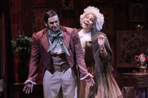 Анна Аглатова – Лизанька Манилова, Тихон Горячев – Манилов, Василий Соколов – Чичиков. Фото Дамира Юсупова / Большой театр
