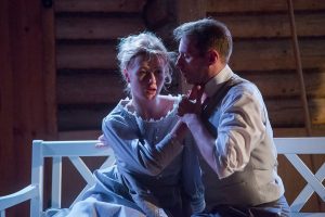 Тем интереснее стала для меня работа Рустема Фесака «Чёрный монах». Честно говоря, я совершенно не представляла, как можно было поставить ТАКОЕ произведение Антона Чехова на театральной сцене (хоть какой). И всё же это оказалось возможным потому, что актёры театра «Чеховская студия» исполняют всё вживую. Они погружают зрителя в повествовательную ткань повести с головой. А зритель…? Зритель уходит в сложный и мятущийся мир магистра философии Андрея Васильевича Коврина (Евгений Пеккер),  сочувствует смятённой душе Тани Песоцкой – невесты, жены (Светлана Герасимович) и даже принимает маниакальное занятие её отца, Егора Семеновича Песоцкого, (Юрий Голышев, засл. артист РФ) собственным садом. Сада, между прочим, не видно – всё действие спектакля разворачивается в зале Театрального двора – деревянном срубе. Но зрителю же дано воображение! То воображение, которое позволяет представлять усадьбу, старый парк и сад, окутанный дымом, полный роз, камелий, тюльпанов…