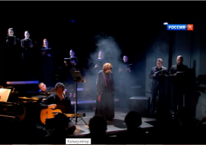 Первоначально спектакль планировали сделать монооперой. Но потом вывели на сцену и хор. Ему вторят фортепиано, гитара, аккордеон. Солирует — сама Елена Камбурова.