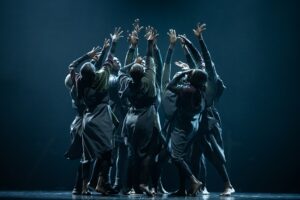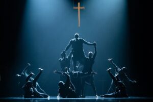 Декорации с крестами по периметру сцены сразу перенесли зрителей в довольно мрачную атмосферу кладбища. Девять танцоров двигались в такт с музыкой, рождаемой голосами a сapella участников творческого квартета. Это «плач скорбящих» – профессиональных плакальщиков. Звук ударных инструментов задавал ритм как некое воплощение абсолюта.
