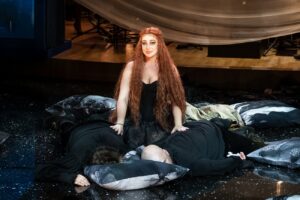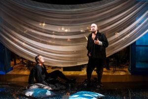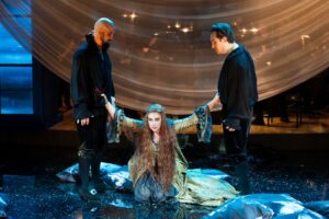 И — на берегах чего? Формально — венецианского канала, хотя вполне возможно, что в сухумском субтропическом уединении Прокофьеву грезились холодные каналы Северной Пальмиры. Или реки крови, залившей покои венецианской ведьмы? Всепоглощающей Леты? Ледяного Коцита? Или просто — реки времён? Каждый да ответит сам для себя на этот вопрос, но это являемое оркестром под управлением Валерия Кирьянова жутковатое ощущение разных берегов, на которых находятся герои — самая сильная черта драматургии спектакля.