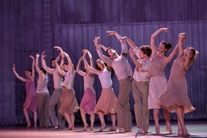 Спектакль длился 70 минут, но было ощущение, что и на 60-ой минуте происходит ровно то, что происходило на 15-ой: концептуальное спектакля – сплошной танцевальный поток, подобие природной стихии (дождь? ветер? облака? солнечный свет?) с нарастаниями и ослаблениями, соответствующим волнам музыки, основанной на повторе одной и той же коротенькой музыкальной фразы, но разной интенсивности и красочности, с флуктуацией танцовщиков и музыкантов из света во тьму (авансцена) или за кулисы, с их возвращением, с переодеванием танцовщиков из одной одежды ненавязчивого дизайна в другую, столь же ненавязчивую, со световой игрой – планшет сцены, изначально комфортного бежевого цвета, то серел, то синел, то багровел, задник – полукруглая металлизированная кисейная штора, – то блестел, то тускнел, то золотился, то серебрился, в итоге возвращаясь к «золоту». Визуально изысканный, светлый и стильный спектакль-бродилка, с очень простым и бесконечно повторяющимся набором движений и приемов, без завязок и кульминаций. Но развязка все-таки случилась – на самой последней минуте – бонусом для тех, кто ее дождался. Выделившаяся из коллектива пара слилась на полу в откровенных объятиях, а последний из убегающей группы артистов провел рукой по веревочному заднику – и занавес, неподвижный почти все 70 минут, наконец-то откликнулся свежей дождевой волной.