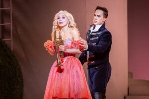 Но к некоторым очень важным частностям — не без претензий. Прежде всего, к звучанию музыки: в тоне оркестра есть некоторая шарманочная плоскость, не хватает лукавого изящества. А в пении – ну что там петь, казалось бы! — при том бесхитростная ариозность или куплетность требует первозданной интонационной простоты вкупе с легкой иронией. Иными словами, необходимо тонкое актерско-музыкантское отношение к этой прелестной «ерунде». А такой высокий класс доступен не всем.
