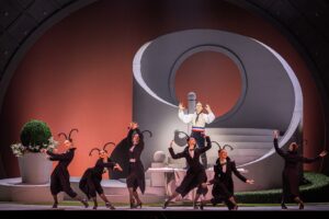 В новом спектакле немало других удачных актерских работ и забавных придумок. Без нажима непосредственен юный Планшар со своей трубой, эффектно победителен он в роли героя-любовника, элегантно ироничен его стареющий генерал. Последовательная трансформация Лили из невинного ангела в скучающую даму, в томную возлюбленную, в брызжущее раздражением отвратное создание и снова в привлекательную женщину сработано контрастно и бесстрашно. Экстравагантна вываливающаяся из куста на колени старого волокиты — инвалида циркачка Леона (Оксана Гогина). А вокруг основных персонажей затейливо вьются словно тушью нарисованные юркие пчелки с усиками-радарами (артисты балета) — расторопные слуги просцениума, они же — прислуга в доме господ Базанкур. Сам же дом преуспевающего финансиста – претенциозная архитектурная композиция с отсылом к конструктивизму, которая на поворотном круге умудряется плавно и бесшумно демонстрировать свои различные ракурсы (сценография Евгения Терехова). И если эта громоздкая махина, заявляющая о «значительности» ее владельца несколько и выглядит слоном в посудной лавке, то явно не без иронии.