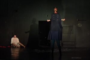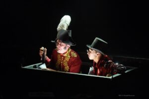 Режиссер определила жанр постановки как «трагическую буффонаду». Ее спектакль на самом деле трагедия, переходящая в паясничанье, фарс и наоборот. Вот мы видим карьерную грезу – веревочную лестницу, по которой майор Ковалев вскарабкивается к своей мечте. А вот и строй чиновников с чернильницами и перьями, но голов нет, а лишь проворные руки чеканят указы и приказы. Спектакль калейдоскопичен, и эта оптика постоянно меняет угол зрения и перспективу. Жандарм вдруг увеличивается до немыслимых размеров. Газетчик, конферансье, канарейка, вся эта фантасмагория рождается из темноты и черноты или сундука. А нос в красивом мундире гуляет сам по себе.