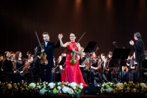 Концертную фантазию для двух скрипок Кузьмы Бодрова на темы из оперы «Евгений Онегин» Петра Ильича Чайковского виртуозно исполнили Павел Милюков и Елена Таросян.