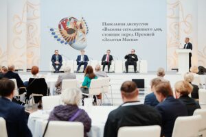 Далее последовала непосредственно панельная дискуссия «Вызовы сегодняшнего дня, стоящие перед Премией “Золотая Маска”», в которой приняли участие Начальник Управления Президента Российской Федерации по общественным проектам Сергей Новиков, Председатель Союза театральных деятелей РФ и Президент Премии и Фестиваля «Золотая Маска» Владимир Машков, Вице-президент Премии и Фестиваля «Золотая Маска» Кирилл Крок, Секретарь СТД РФ Андрей Борисов.